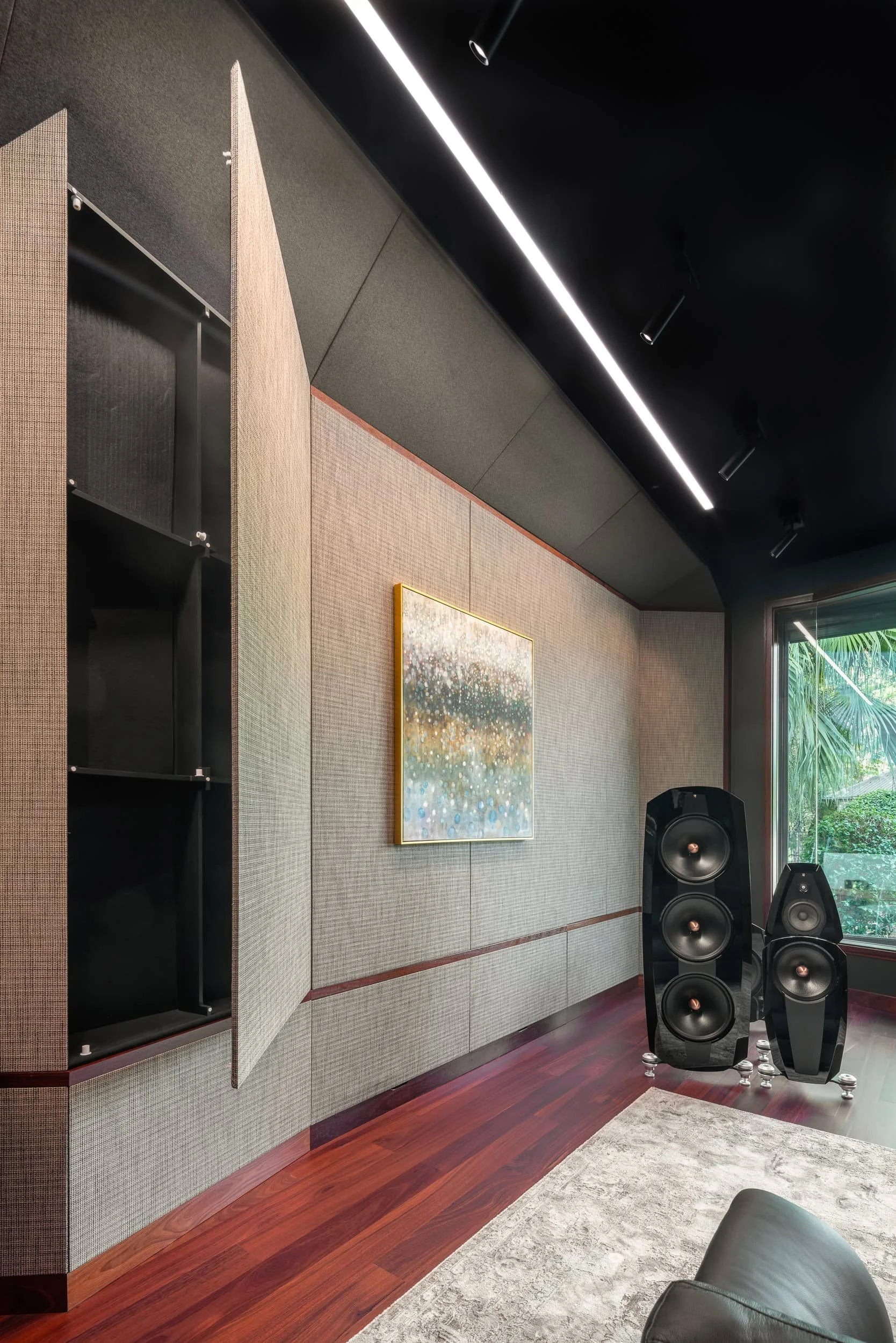This room is a box within a box. The inner room is completely insulated from the outside world so as to protect it from any external noise pollution. The walls are designed to have no parallels from side to side, to reduce sound reflections. The acoustic panelling along the walls neutralises reflection, while also hiding storage spaces behind. The rear wall features vertical louvres that not only protect sound, but also hide a venting for the room’s silent climate control system.