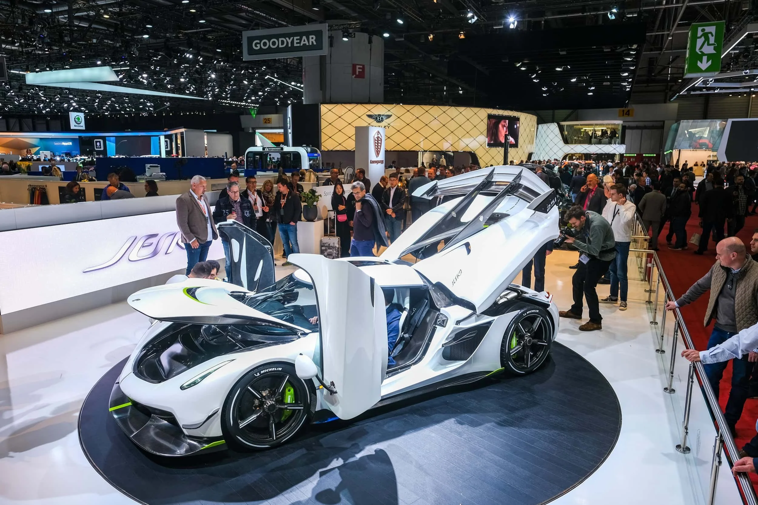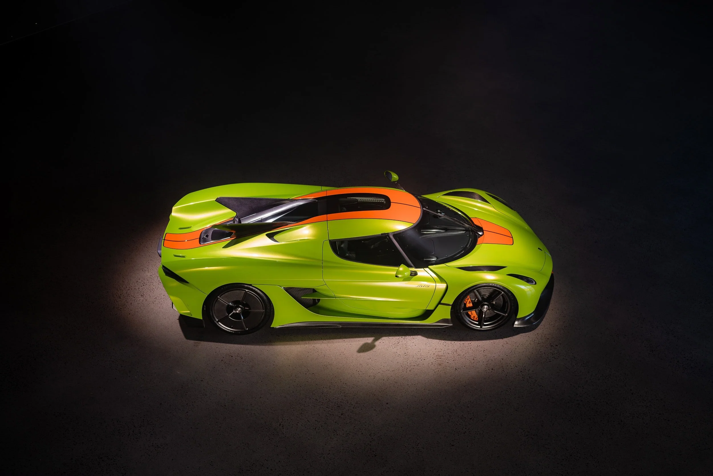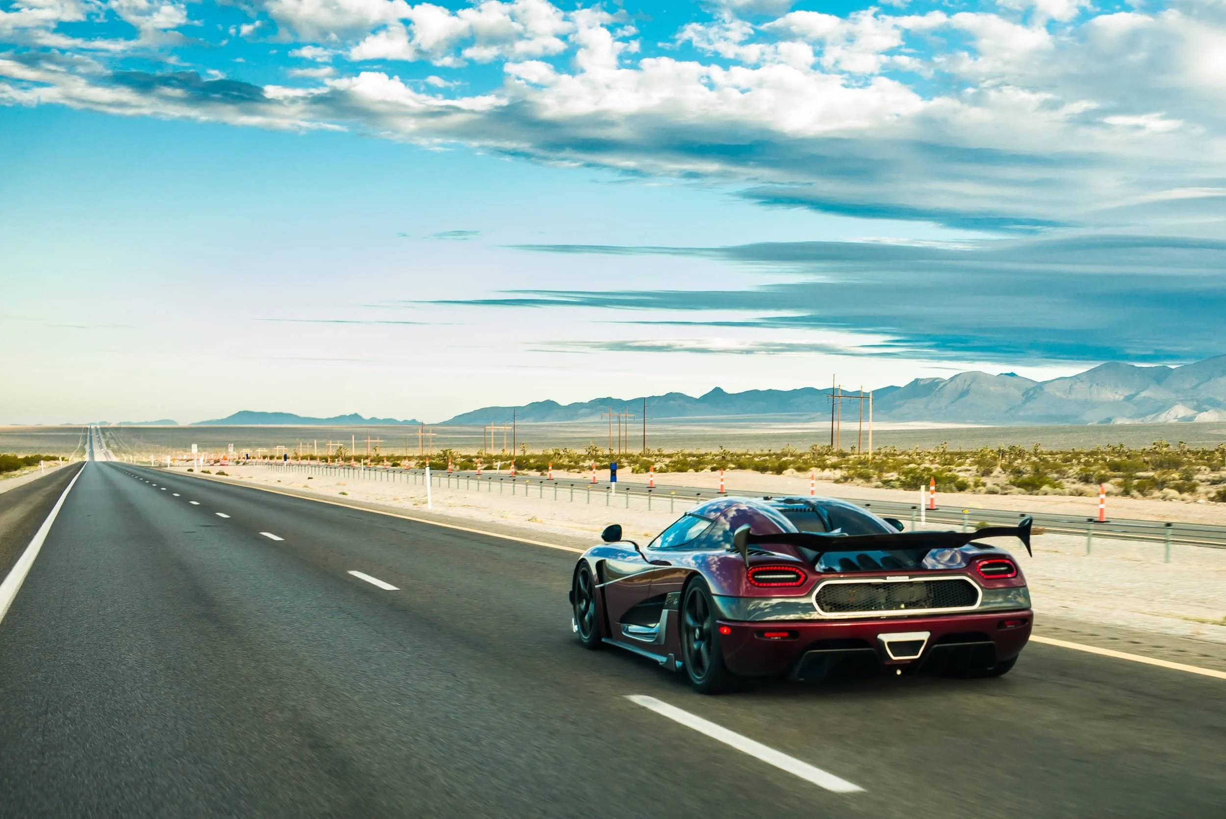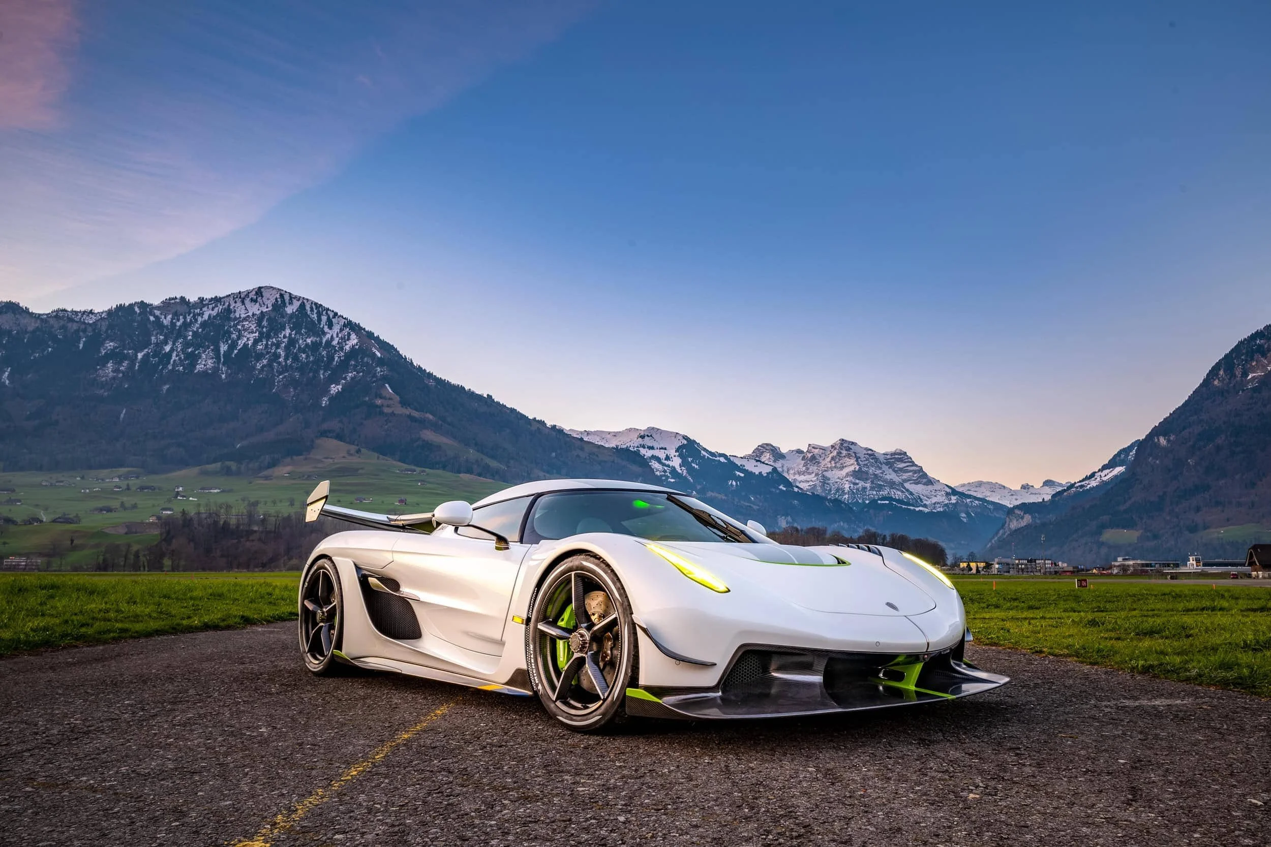 A Koenigsegg Jesko parked on a runway during sunrise with mountain range and a leafless tree in the background.
